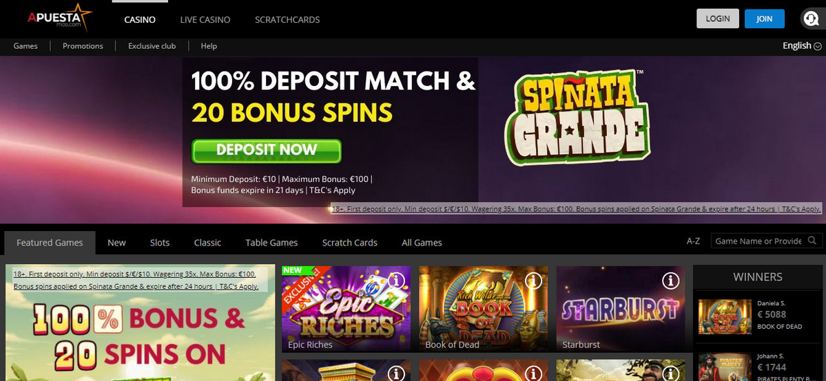 Offer will be given as follows: 20 bonus spins on Spinata Grande and 100% bonus upon first deposit. Apuestamos