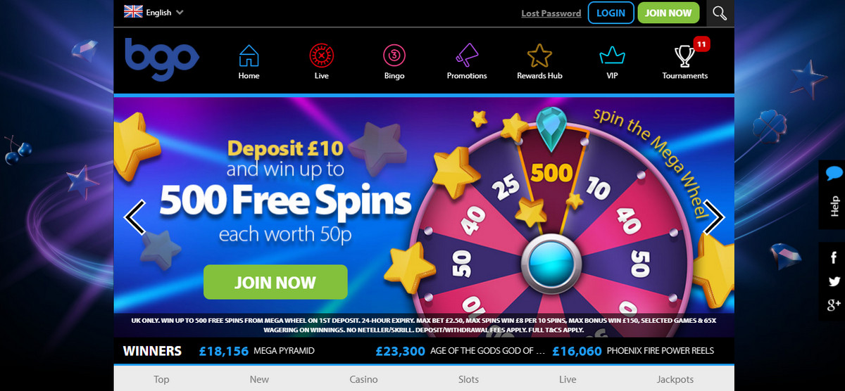 With their first deposit BGO players get one spin on the Mega Wheel where they can win up to 500 free spins.