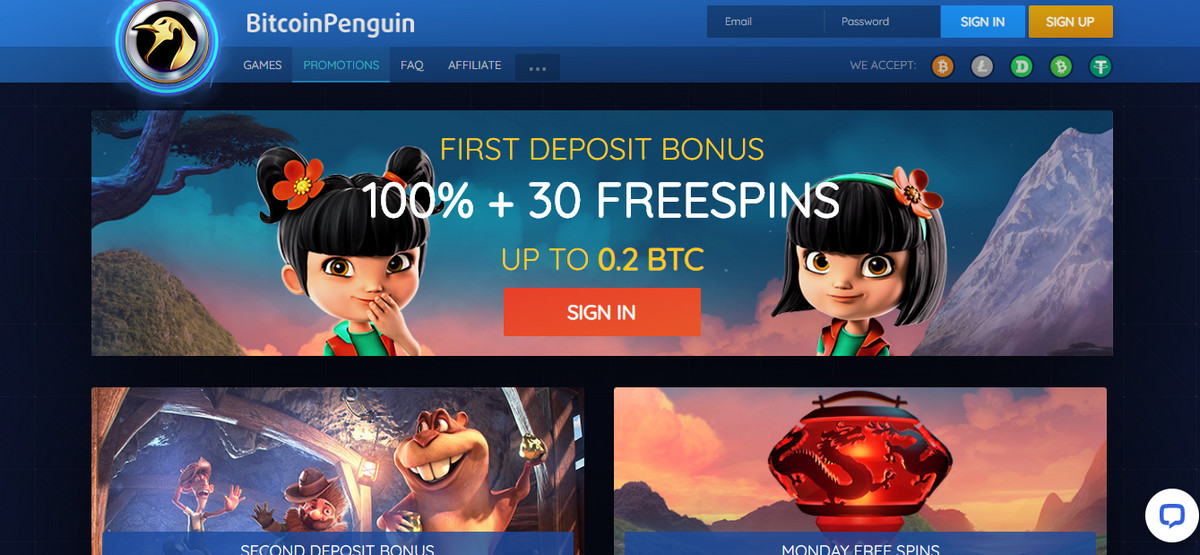 Deposit as low as 0.001 BTC, 0.05 ETH, 0.03 BCH, 0.1 LTC, 3,500 DOG, and 20 USDT on any Friday and get refreshing 25 freespins for our best slot games including Platinum Lightning Deluxe, Aztec Magic Deluxe, and Slotomon Go! Bitcoinpenguin