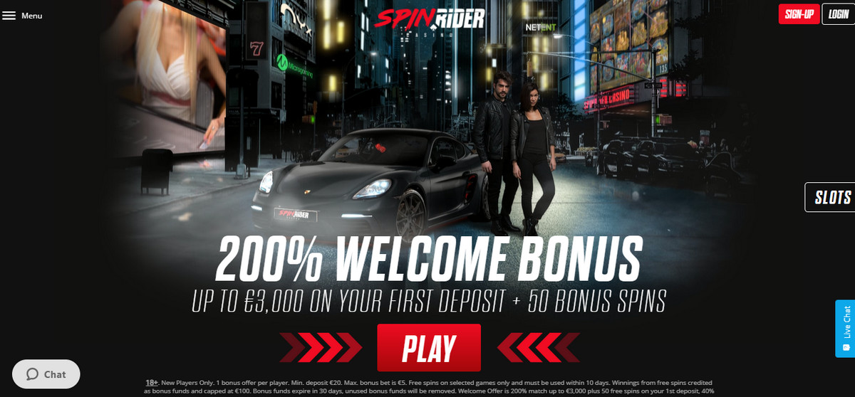 18+. New Spinrider Players Only. 1 bonus offer per player. Min. deposit €20. Max. bonus bet is €5. Free spins on selected games only and must be used within 10 days. Winnings from free spins credited as bonus funds and capped at €100. Bonus funds expire in 30 days, unused bonus funds will be removed. Welcome Offer is 200% match up to €3,000 plus 50 free spins on your 1st deposit, 40% match up to €1,000 plus 20 free spins on your 2nd deposit, and 80% match up to €500 plus 40 free spins on your 3rd deposit. Bonus funds are separate to Cash funds, and are subject to 35x wagering the total bonus money, deposit and free spins. Only bonus funds contribute towards any wagering requirements. Spinrider Terms apply. Please gamble responsibly. www.gamblingtherapy.org