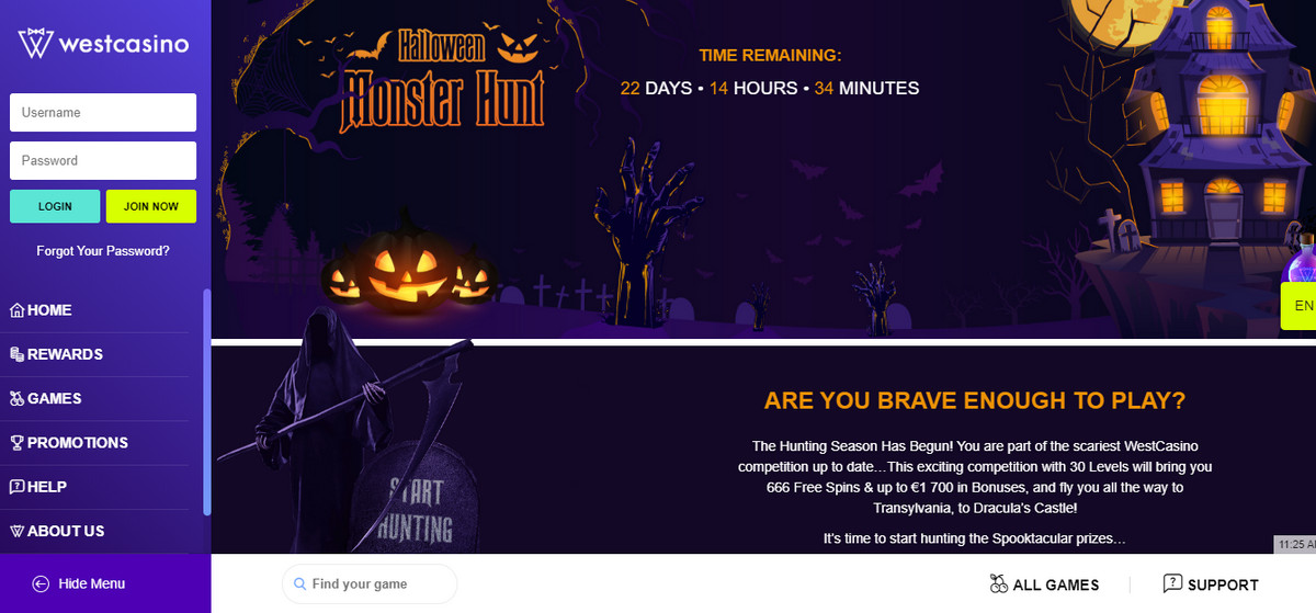 The Hunting Season Has Begun! You are part of the scariest Westcasinocompetition up to date…This exciting competition with 30 Levels will bring you 666 Free Spins & up to €1 700 in Bonuses, and fly you all the way to Transylvania, to Dracula’s Castle!